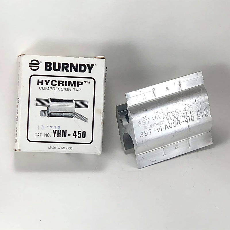 Bymmetallic connector for aluminum alloy compression derivation for 80-185/12-18-185mm2 section, with inhibitory compound, used for medium and low voltage networks, other technical characteristics and details according to specification. Ref. Brand Burndy model YHN – 450